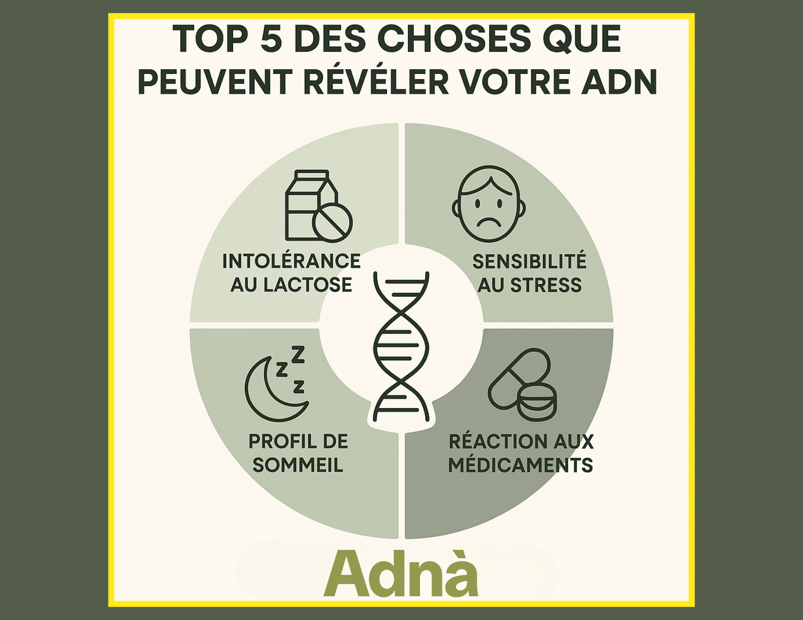 Pour aller encore plus loin, Adnà propose un test tout-en-un regroupant nos principales analyses santé, nutrition et bien-être. Un moyen simple, complet et confidentiel d’avoir une vue d’ensemble sur votre profil génétique.